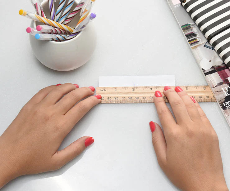 Usa un righello per misurare dal bordo della carta fino alla linea segnata. Non dimenticare di misurare con precisione in millimetri, poiché si tratta della circonferenza del tuo dito. Annota la tua misura su un foglio di carta.